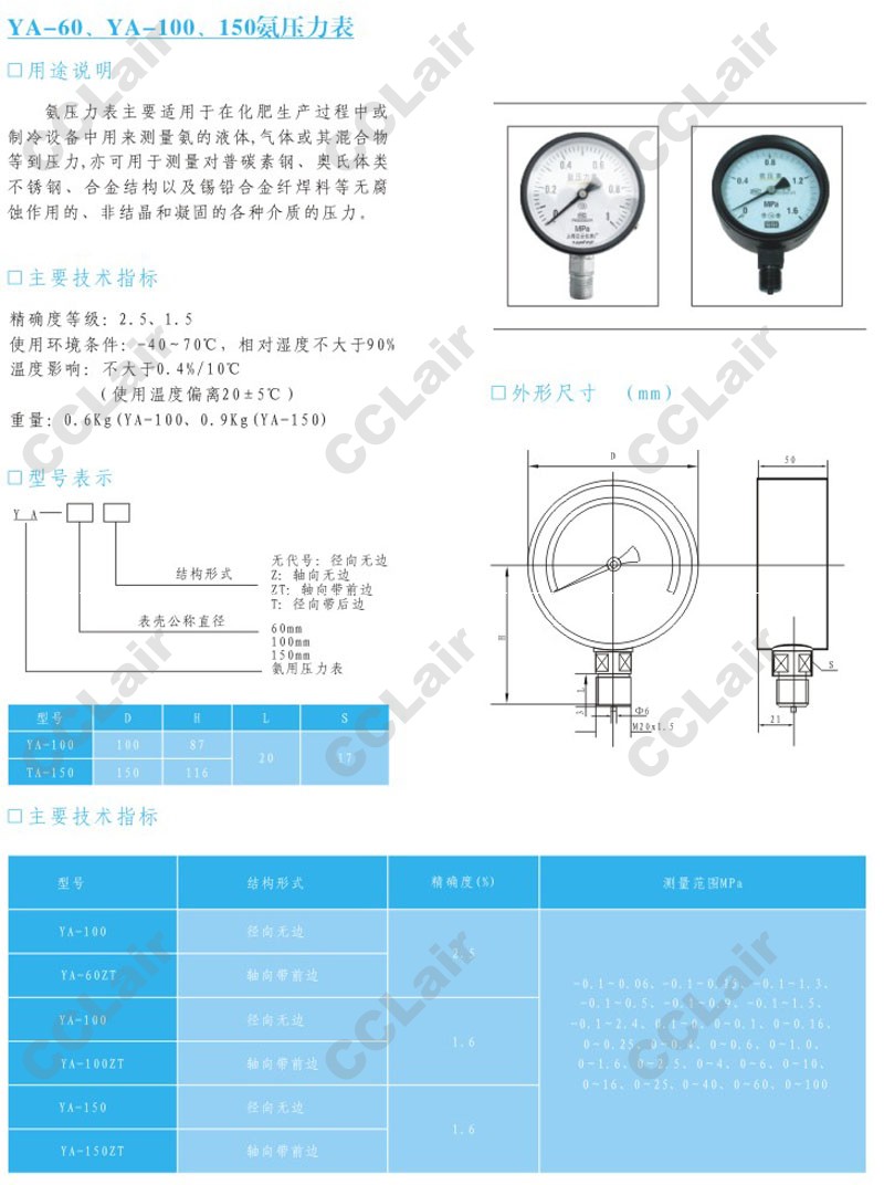 YA-60,YA-60ZT,YA-100,YA-100ZT,YA-150,YA-150ZT,氨压力表,CCLair