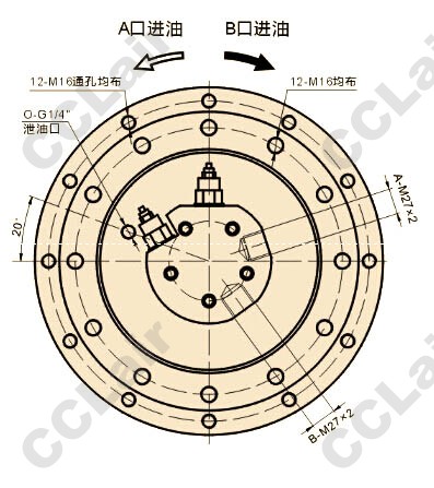 型 号 | 扭矩N.m | 转速范围r/min | 传动比 | 压力Mpa | 总排量 | 液压马达 | 总重 | 适用机重ton | ||||