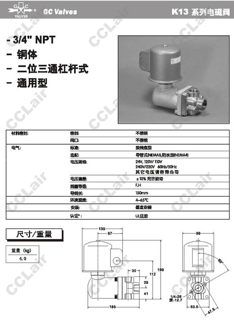 K13DF1252,K13DF1352,K13DF1452,K13DF1552,GC Valves二位三通杠杆式电磁阀