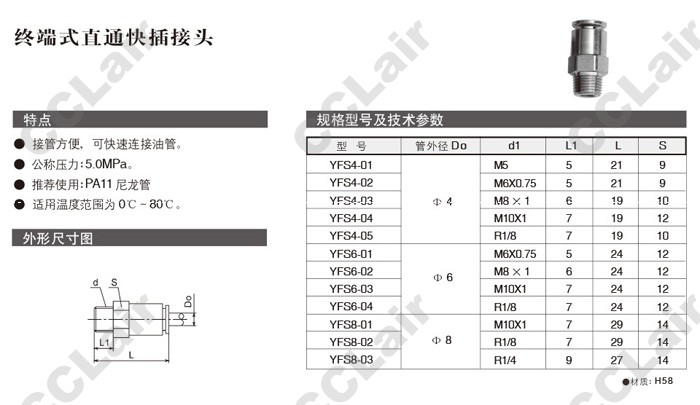 YFS4,YFS6,YFS8,YFS8-01,YFS8-02,YFS4-03,YFS4-04,YFS6-01,YFS6-02,终端式直通快插接头