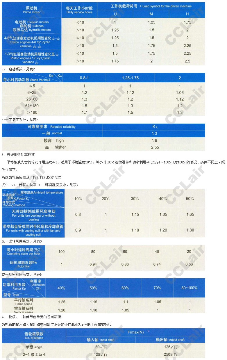 平等轴系列齿轮箱的公称输入功率PA(表9—20)按载荷平稳,每天工作时间小于或等于10h,每小时启动不超过5次,允许启动转矩为工作转矩的2倍,单向运转,单对齿轮的接触强度安全系数约为1,失效率概率小于或等于1%等条件计算确定的。齿轮箱双向运转时,需视情况将PN乘上0.8—1.0的系数,当反向载荷大,换向频繁、选用的可靠度系数KR较低时,系数取较小值,反之取较大值。
