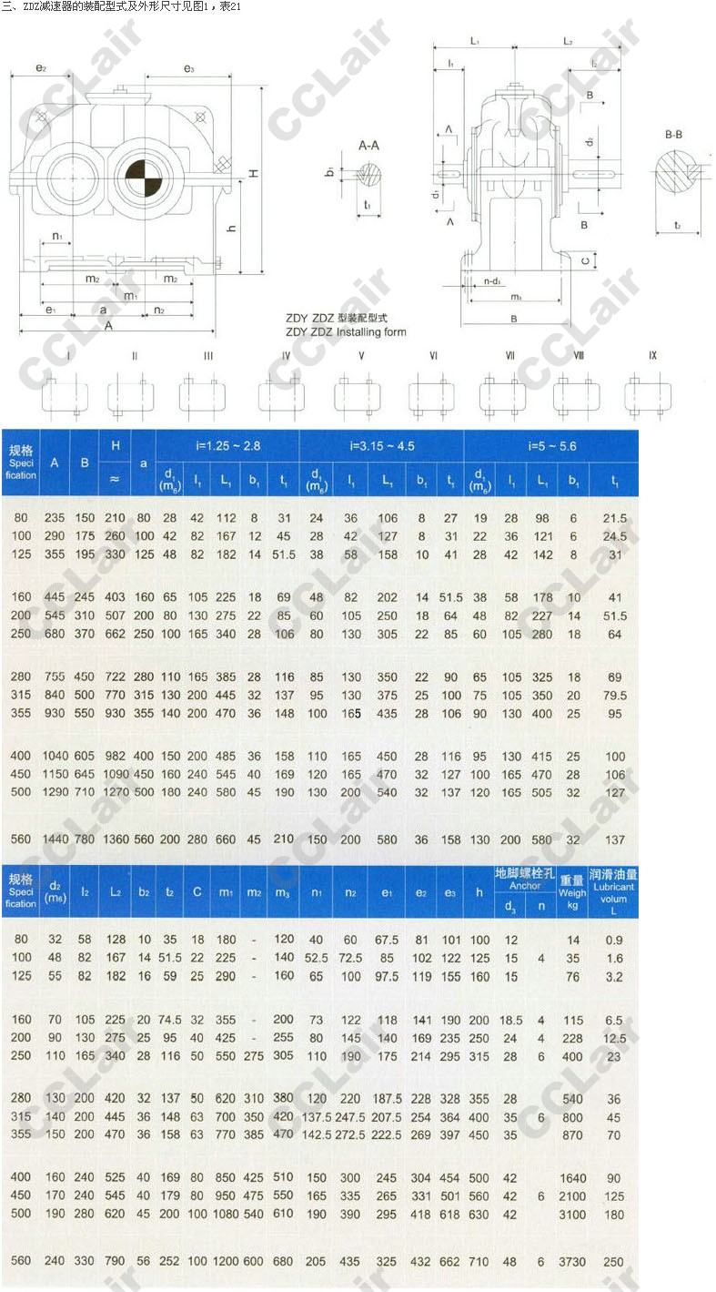 三、ZDZ减速器的装配型式及外形尺寸见图1,表21