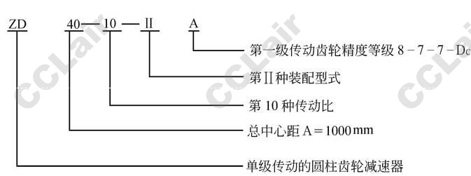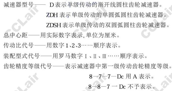 在减速器的代号中,包括减速器的型号,总中心距,传动比,装配型式及齿轮精度等级.