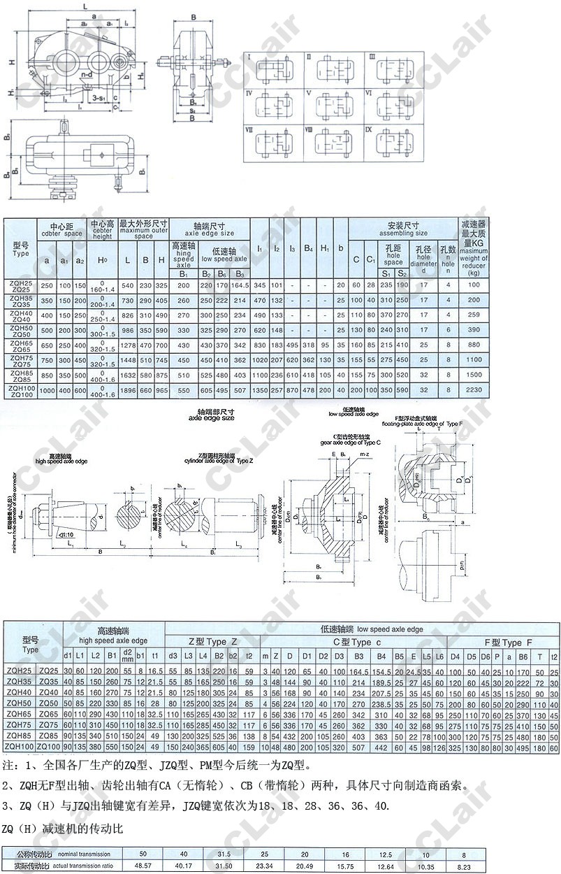 ZQ与ZQH型圆柱齿轮减速器相比,除因齿形不同外,其他均相同.