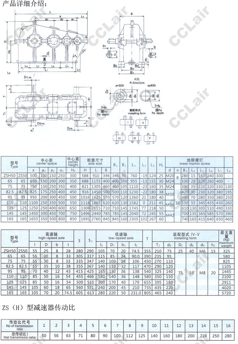 ZS50,ZS65,ZS75,ZS82.5,ZS95,ZS110,ZS125,ZS145,ZS165,圆柱齿轮减速机