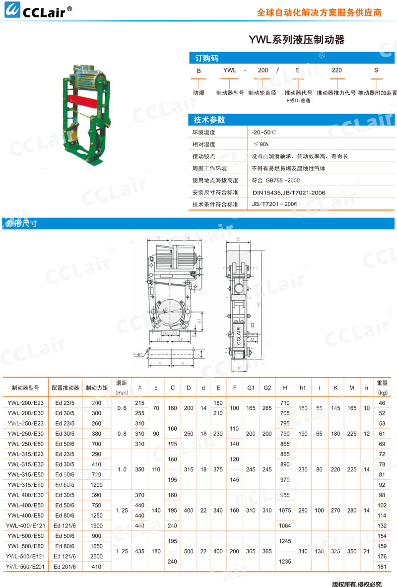 YWL-200,YWL-250,YWL-315,YWL-400,YWL-500,YWL-400/E121,YWL-200/E23,BYWL-200/E23,液压制动器