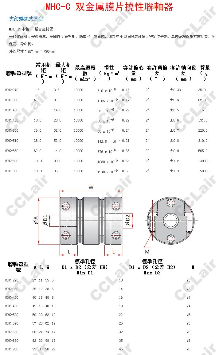 MHC-27C,MHC-35C,MHC-40C,MHC-45C,MHC-50C,MHC-57C,MHC-68C,MHC-82C,MHC-95C,双金属膜片挠性联轴器