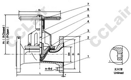部件列表:1.阀体 2.阀体衬里 3.隔膜 4.阀瓣 5.阀杆 6.阀盖 7、手轮