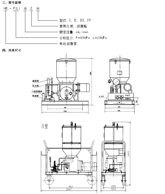 HB-P系列电动润滑泵适用于润滑点多、分布范围广、给油频率高、公称压力为40(20MPa)的单、双线干(稀)油集中润滑系统中,作为供送润滑剂的装置,还可配备移动小车、胶管、油枪及电缆组成移动式电动润滑泵装置以便用于给油频率低,润滑点少,给油量大且不便于采用集中润滑的单机设备,进行移动给油,贮油桶还设有油位自动报警装置,如配以相应的电气控制箱还可实现自动控制,并对系统进行监视。