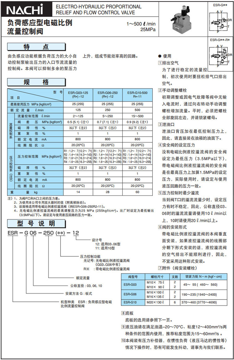 ESR-G03,ESR-G06,ESR-G10,ESR-G03-125-12,ESR-G06-250R1-12,ESR-G10-500R2-11,NACHI电磁比例流量控制阀