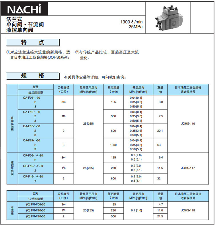 CA-F06,CA-F10,CA-F16,CP-F06,CP-F10,CP-F16,CA-F24-3-30,CP-F06-2-*-30,NACHI单向阀