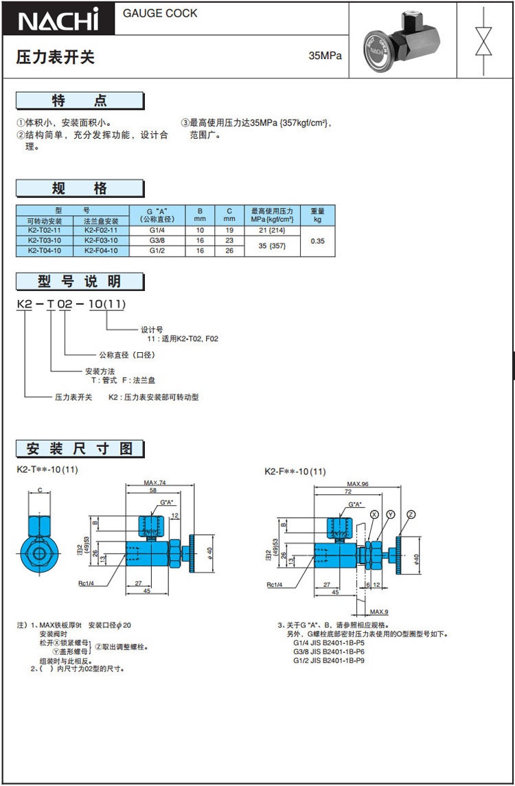 K2-T02-11,K2-T03-10,K2-T04-10,K2-F02-11,K2-F03-10,K2-F04-10,NACHI压力表开关