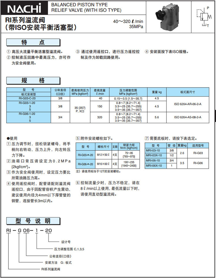 RI-G03-C-20,RI-G03-1-20,RI-G06-1-20,RI-G06-3-20,RI-G03-5-20,RI-G06-5-20,RI-G03-3-20,NACHI溢流阀
