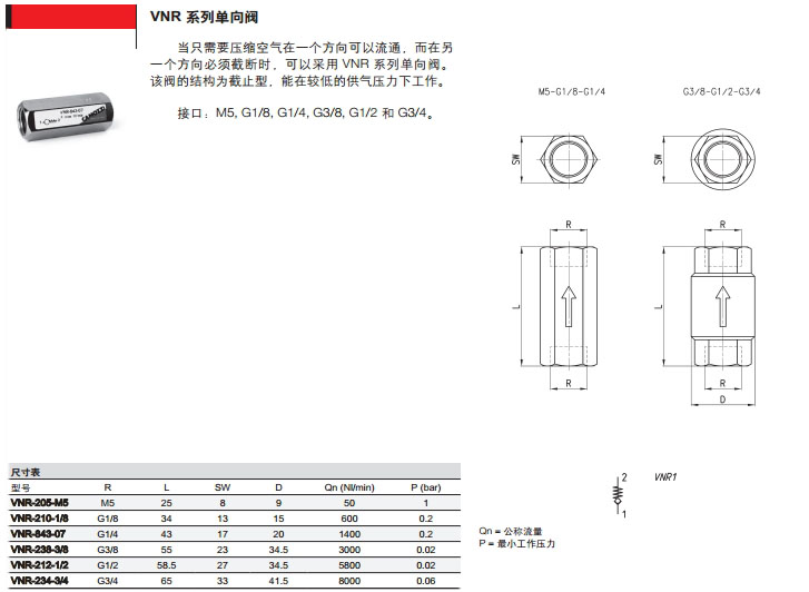 VNR-205-M5,VNR-210-1/8,VNR-843-07,VNR-238-3/8,VNR-212-1/2,camozzi单向阀