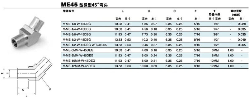 V-ME-1/8-W-45DEG,V-ME-1/4-W-45DEG,V-ME-3/8-W-45DEG,V-ME-1/2-W-45DEG,微型45度弯头