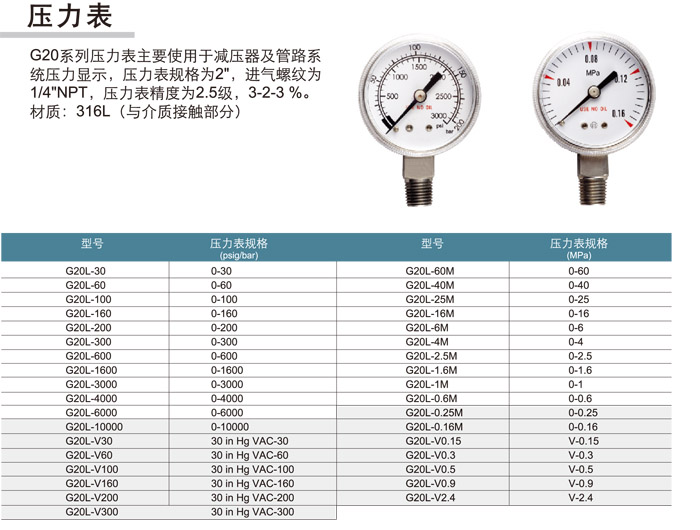 G20L-30,G20L-60,G20L-100,G20L-160,G20L-200,G20L-300,G20L-600,G20L-1600,G20L-3000,压力表