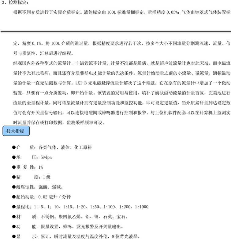 LXI-B光电磁悬浮流量仪目前已广泛应用于化工、石油、医疗、制药、机械、科研等领域,适用于各种气体及液体。