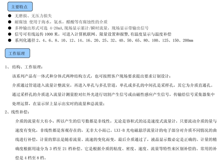 LXI-B光电磁悬浮流量仪的各项技术指标的可塑性较强,故每一套仪器都是根据用户的具体要求而单独定制的。要求不同,材质、零部件、性能等技术指标都不同。