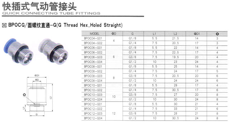 BPOC04-G01,BPOC06-G01,BPOC08-G01,BPOC10-G01,BPOC12-G01,BPOC04-G02,快插式气动管接头