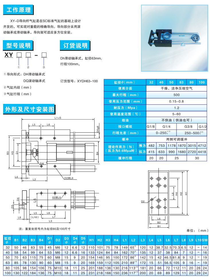 XYDH32-100,XYDH40-100,XYDH50-100,XYDQ63-100,XYDQ80-100,XYDQ100-100,导杆气缸