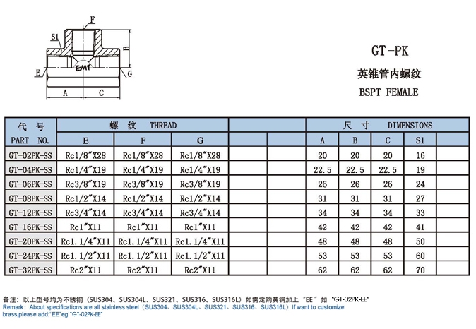 GT-02PK-SS,GT-04PK-SS,GT-12PK-SS,GT-24PK-SS,GT-32PK-SS,三通内丝接头
