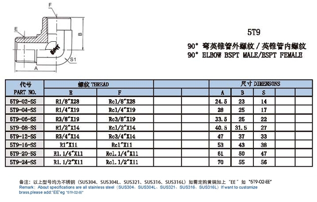 5T9-02-SS,5T9-04-SS,5T9-06-SS,5T9-08-SS,5T9-12-SS,5T9-24-SS,直角内外丝接头