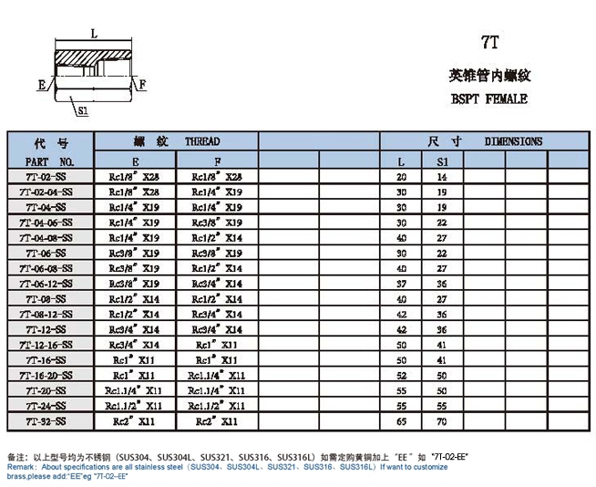 7T-02-SS,7T-04,7T-06,7T-08,7T-12,7T-16,7T-20,7T-24,7T-32,直通内丝接头