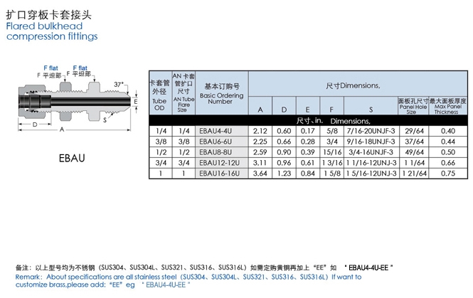 EBAU4-4U,EBAU6-6U,EBAU8-8U,EBAU12-12U,EBAU16-16U,直通扩口穿板卡套接头