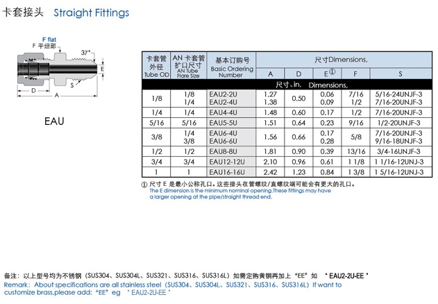 EAU2-2U,EAU2-4U,EAU4-4U,EAU5-5U,EAU6-4U,EAU6-6U,EAU8-8U,直通扩口卡套接头