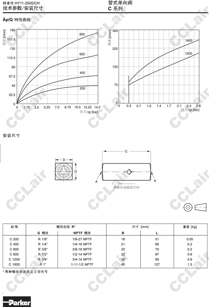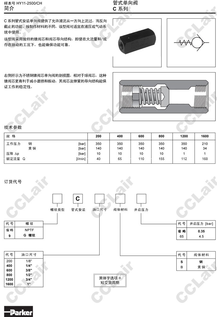C200S,C400S,C800S,C1200S,C1600S,C200B,C400B,C800B,C1200B,C1600B,Parker管式单向阀
