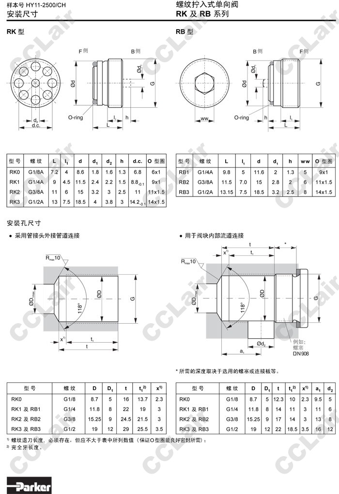 RK0,RK1,RK2,RK3,RB1,RB2,RB3,Parker螺纹拧入式单向阀