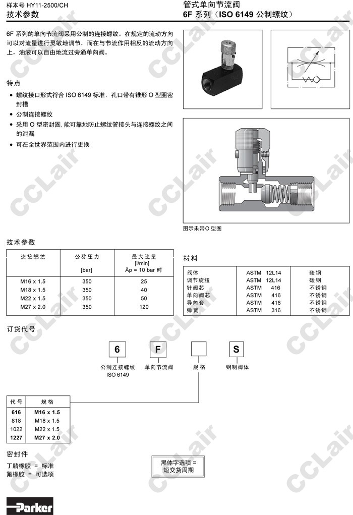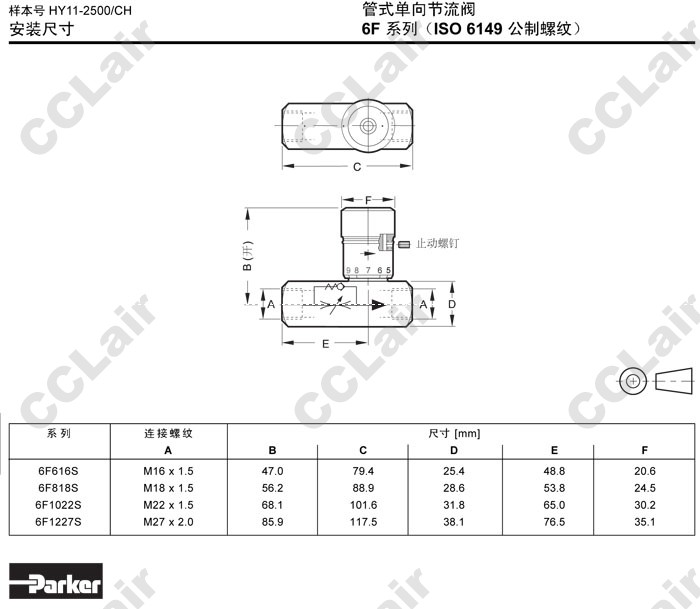 6F616S,6F818S,6F1022S,6F1227S,Parker管式单向节流阀