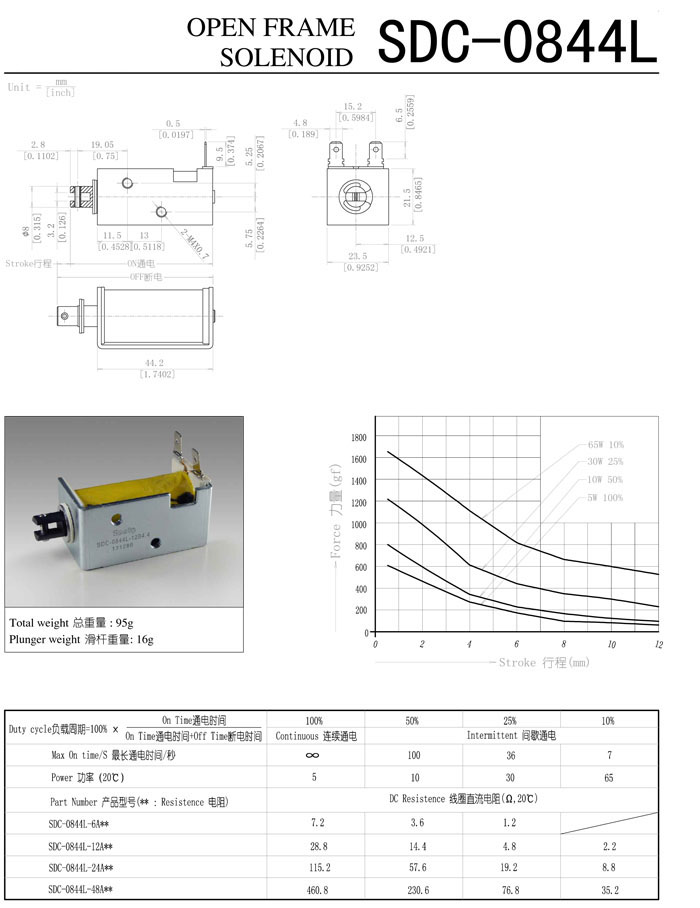 SDC-0844L-6A,SDC-0844L-12A,SDC-0844L-24A,SDC-0844L-48A,直动电磁铁
