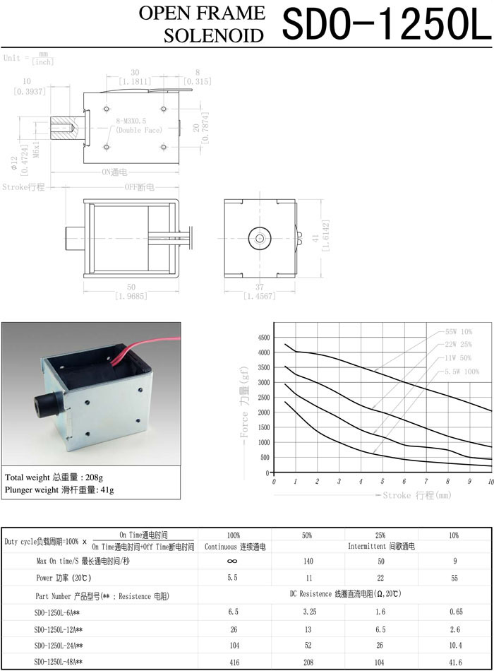 SDO-1250L-06A,SDO-1250L-12A,SDO-1250L-24A,SDO-1250L-48A,直动电磁铁