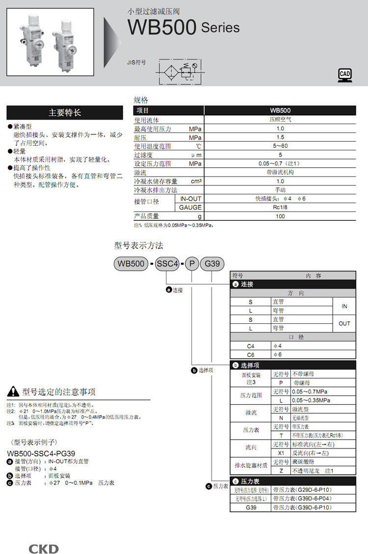 WB500-SSC4,WB500-SSC6,WB500-SLC4,WB500-SLC6,WB500-LSC4,WB500-LSC6,WB500-LLC4,WB500-LLC6,CKD过滤减压阀