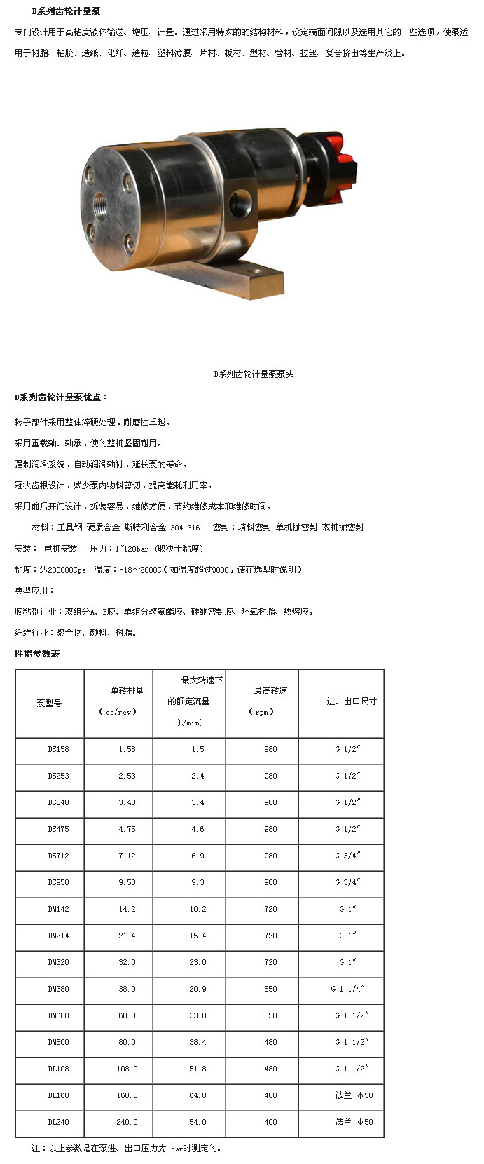 DS158,DS253,DS348,DS475,DS712,DS950,DM142,DM214,DM320,DM380,DM600,DM800,DL108,DL160,DL240,齿轮计量泵