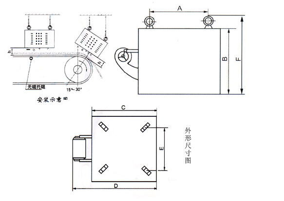 项目 | 适应带宽 | 额定吊高h | 磁场强度 | 物料厚度 | 风机功率 | 励磁功率 | 适应带速 | 重量 | 外型尺寸mm | ||||