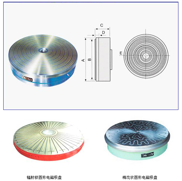 圆形电磁盘是各种圆台式平面磨床的主要部件,用以吸持异磁材料进行磨削加工。面板经过特殊处理,强度高,精度稳定,无渗漏,可以长时间放在切削液中工作,可防止切削液腐蚀,延长了磁盘的使用寿命,吸力均匀,吸力≥120N/cm2。