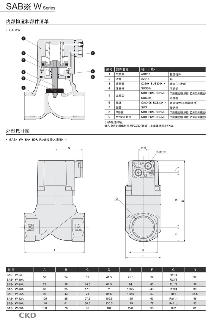 SAB3W-15,SAB3W-20,SAB3W-25,SAB3W-32,SAB3W-40,SAB3W-50,CKD气控式2通阀