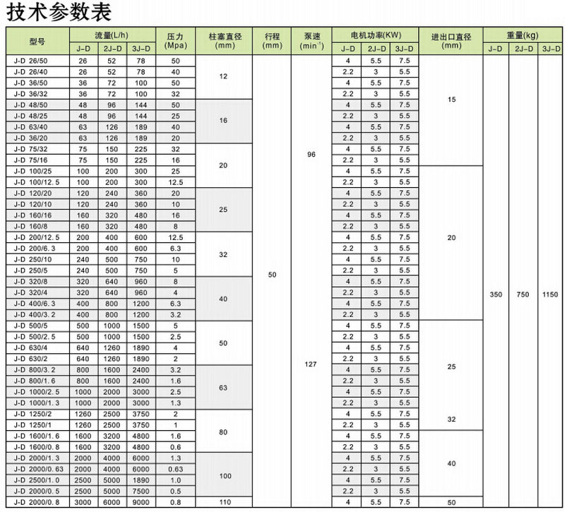J-D-26/50,J-D-26/40,J-D-36/50,J-D-36/32,J-D-48/50,J-D-48/25,J-D-63/40,柱塞式计量泵