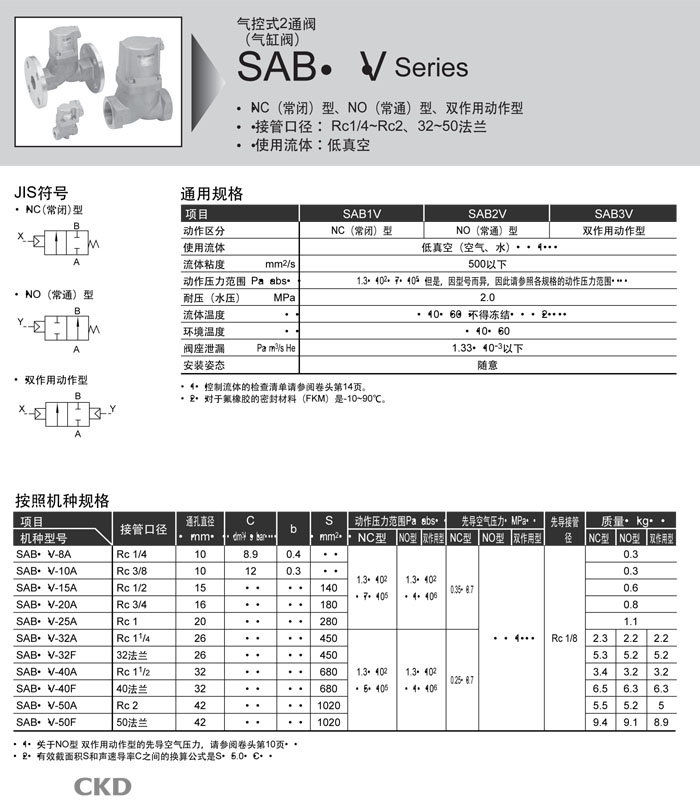 SAB1V-8A,SAB1V-10A,SAB1V-15A,SAB1V-20A,SAB1V-25A,SAB1V-32A,SAB1V-32F,SAB1V-40A,CKD气控式2通阀