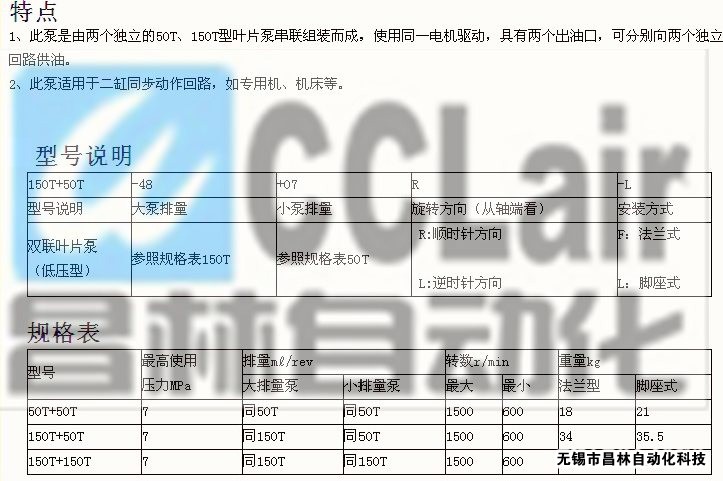 50T+50T,150T+50T,150T+150T,双联低压定量叶片泵