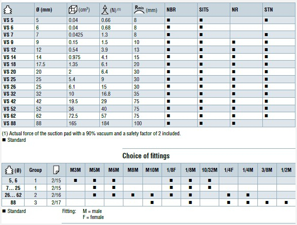 VS系列波纹管吸盘,波纹形2.5褶,Ø5 - 88mm,材料:丁腈橡胶(NBR),天然橡胶(NR),半透明硅胶(SIT5),Siton(STN)。