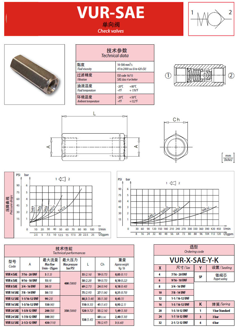 VUR4SAE,VUR6SAE,VUR8SAE,VUR10SAE,VUR12SAE,VUR16SAE,VUR20SAE,单向阀