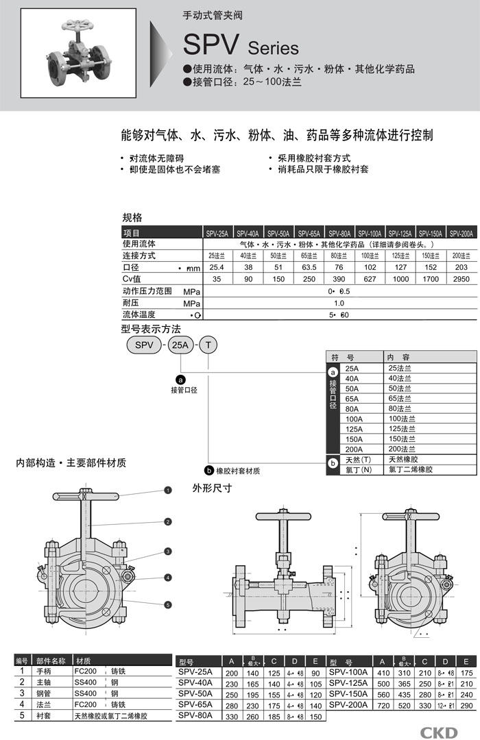 SPV-25A,SPV-40A,SPV-50A,SPV-65A,SPV-80A,SPV-100A,SPV-125A,SPV-150A,SPV-200A,CKD手动式管夹阀