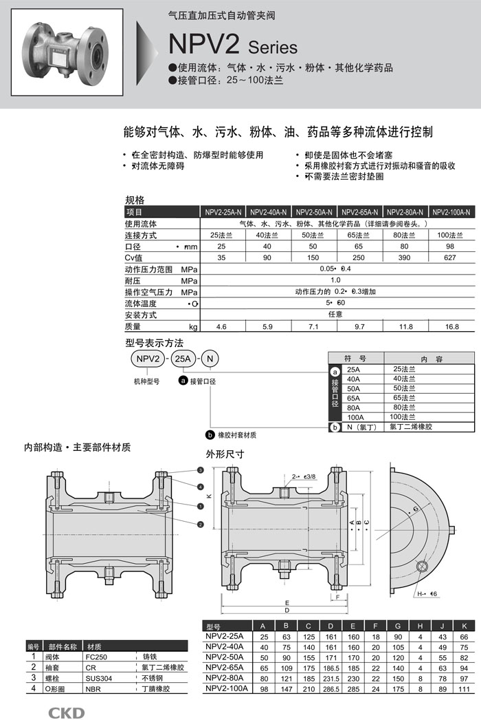 NPV2-25A-N,NPV2-40A-N,NPV2-50A-N,NPV2-65A-N,NPV2-80A-N,NPV2-100A-N,CKD直压式自动管夹阀