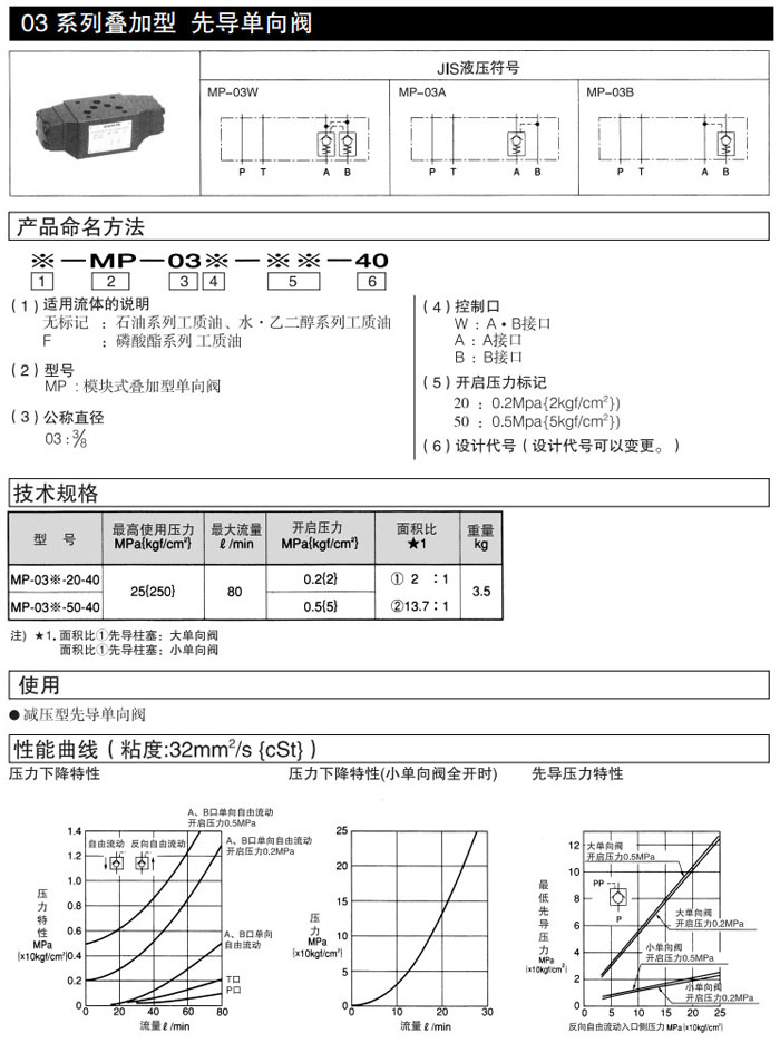 MP-03W-20-40,MP-03W-50-40,MP-03A-20-40,MP-03A-50-40,MP-03B-20-40,MP-03B-50-40,DAIKIN叠加型先导单向阀