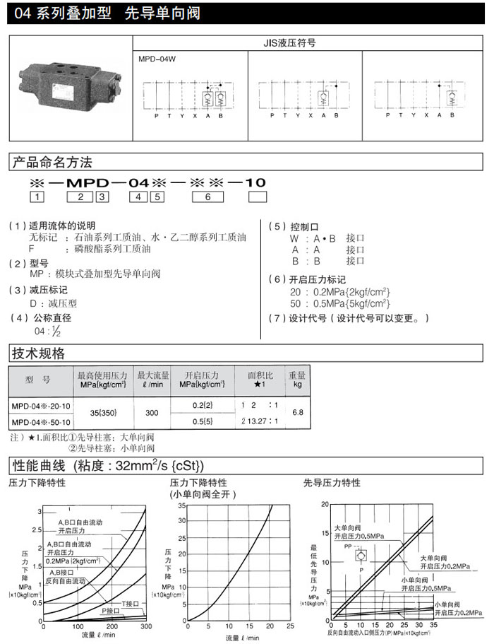 MPD-04W-20-10,MPD-04W-50-10,MPD-04A-20-10,MPD-04A-50-10,MPD-04B-20-10,MPD-04B-50-10,DAIKIN叠加型先导单向阀
