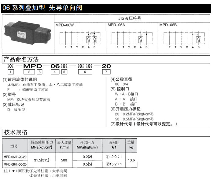 MPD-06W-20-20,MPD-06A-20-20,MPD-06B-20-20,MPD-06W-50-20,MPD-06A-50-20,MPD-06B-50-20,DAIKIN叠加型先导单向阀