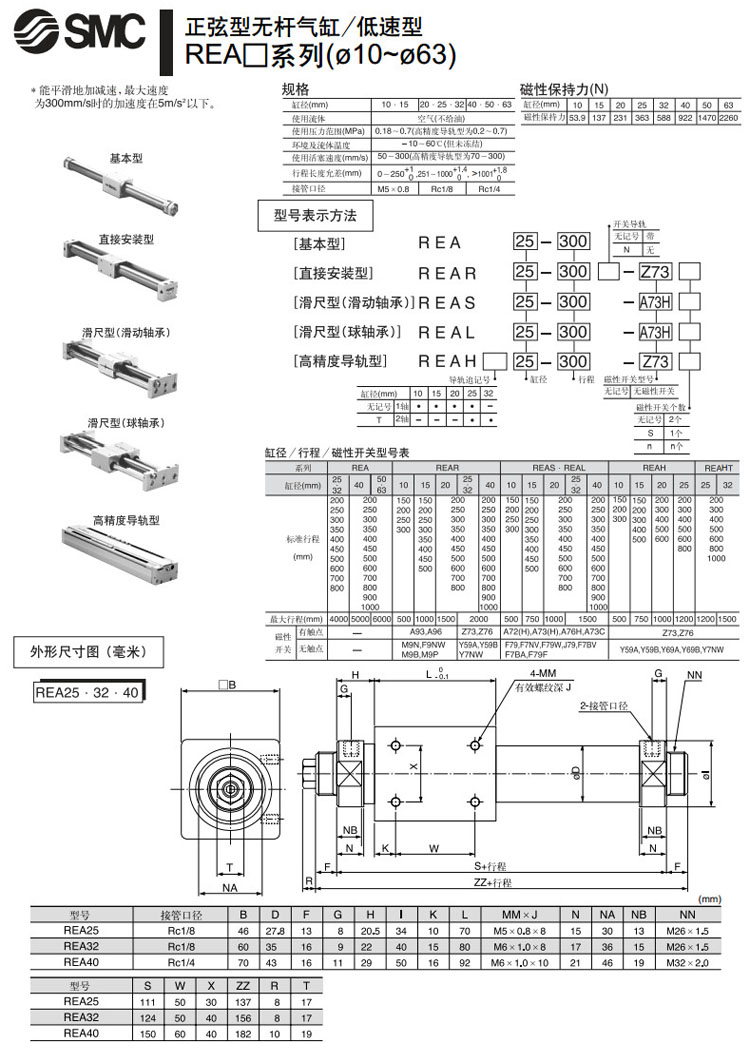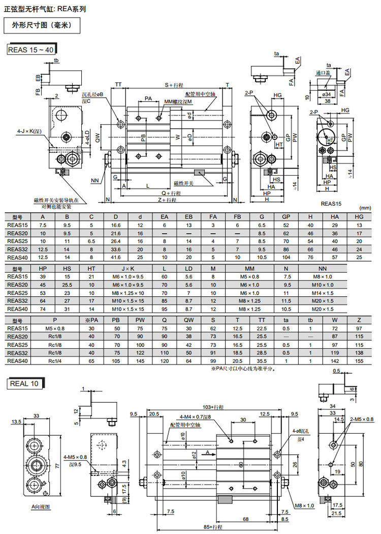 REA25-200,REA32-200,REA40-200,REA50-200,REA63-200,REA25-250,REA32-250,SMC正弦无杆气缸